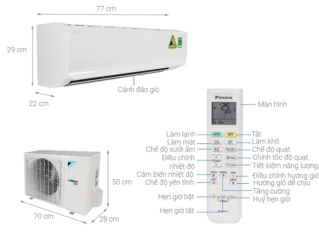 Thông tin cục nóng: Dài 70 cm - Cao 50 cm - Dày 28 cm